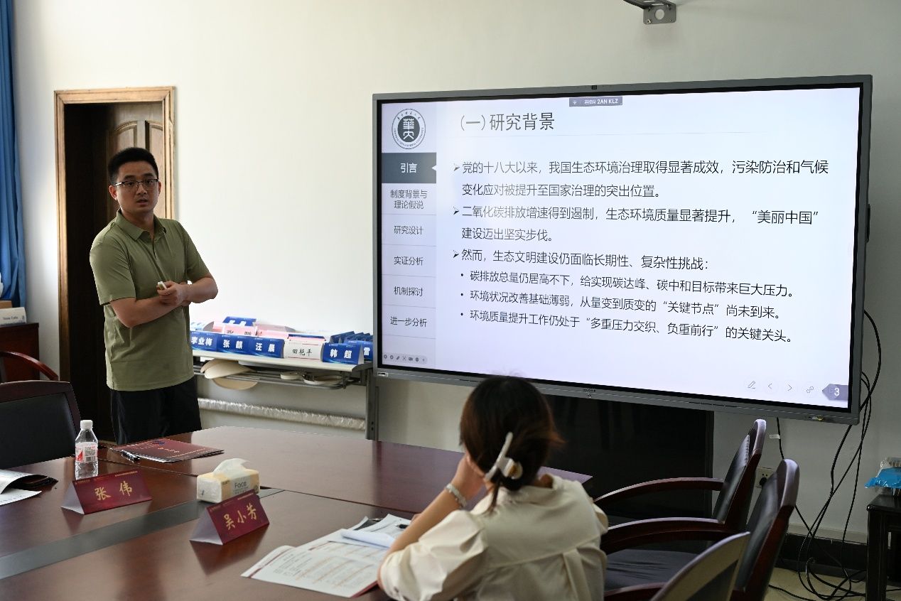 首先,华中师范大学朱俊鹏教授分享了题为《环保垂直管理改革的减污降碳协同效应:来自中国的证据》的最新研究成果。基于减污降碳背景,朱俊鹏教授将减污与降碳效应纳入统一的分析框架,系统考察了垂直管理改革的减污降碳协同效应,试图厘清环保垂改是否实现了环境效益、经济效益、社会效益的“共赢”。接着,从多个维度提出垂直管理改革间接实现减污降碳协同的机制。随后,采用省驻市环境监测中心成立时间,构建DID模型,并进行了平行趋势检验、稳健性检验和异质性分析。在交流环节,与会师生对环境、经济、社会效益统一与污染物衡量与替换指标、政策内生性、机制检验等问题展开了热烈的讨论。
