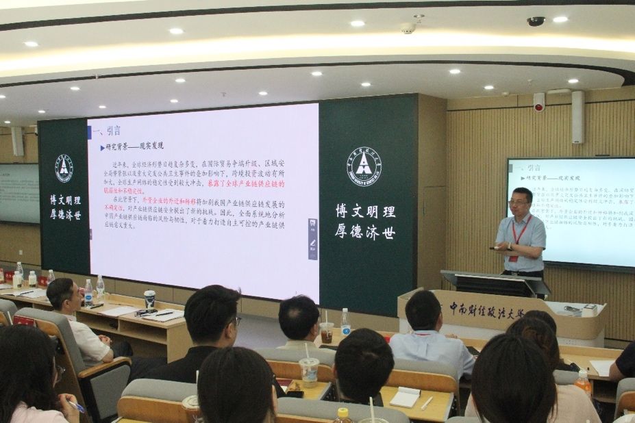 本次论坛特邀东南大学邱斌教授、厦门大学彭水军教授、中国社会科学院大学倪红福教授、湖南大学谢锐教授、中央财经大学段玉婉教授、浙江大学周默涵副教授、北京工业大学张鹏杨教授以及本校“全球价值链与创新发展”青年科研创新团队负责人张亮老师担任主讲嘉宾。经济学院“全球价值链与创新发展”青年科研创新团队核心成员杨波教授和潘安教授担任本次论坛主持人。此外,南京信息工程大学大学孙少勤教授、中南财经政法大学刘绮霞教授、袁凯华副教授、黄晓琪博士、舒中桥博士、张群副教授以及《中南财经政法大学学报》易会文博士等校内外40余名师生齐聚一堂,共同参与了这场学术盛宴。