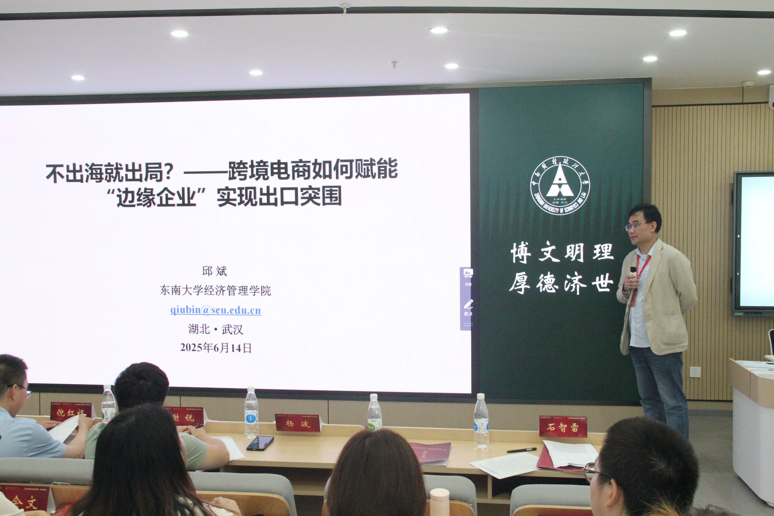 论坛首先由东南大学邱斌教授带来题为《不出海就出局?——跨境电商如何赋能“边缘企业”实现出口突围》的精彩报告。邱斌教授首先指出当前出口企业面临的核心问题已从是否出口转向如何有效拓展出口结构,这一挑战对原本出口范围有限、资源配置能力不足的“边缘企业”而言尤为严峻,而现实中大量跨境电商企业面临两端缺位的困境。随后,邱教授介绍了一个嵌入跨境电商平台机制的异质性企业一般均衡模型,并结合2000-2015年企业微观数据进行实证分析,发现跨境电商有助于“边缘企业”通过降低固定成本和贸易成本以及提高产品的可替代性实现拓展出口产品种类。在交流环节,与会师生对模型构建、内生性、机制检验等问题展开了热烈的讨论。