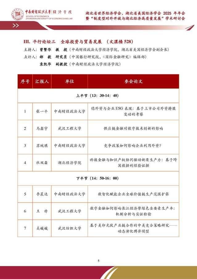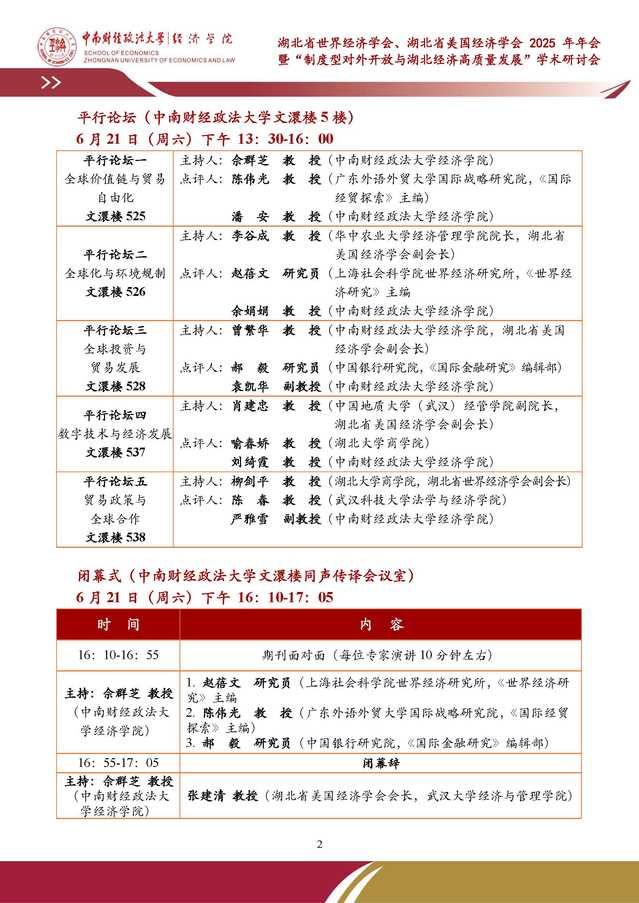 【学术会议】湖北省世界经济学会、湖北省美国经济学会2025年年会暨“制度型对外开放与湖北经济高质量发展”学术研讨会 会议议程